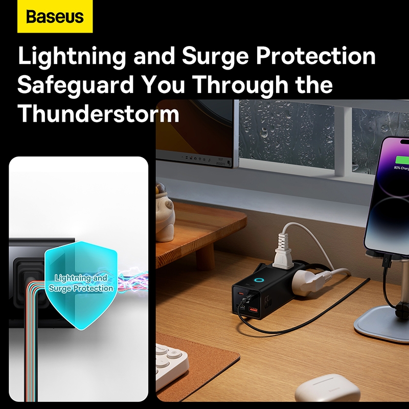 • 🛡️ BẢO VỆ CHỐNG SÉT & TỰ NGẮT (BDIP): Công nghệ Baseus Digital Intelligent (BDIP) tự động ngắt (Auto Shutoff) khi quá tải, bảo vệ thiết bị. Tích hợp "Lightning and Surge Protection" (Chống Sét), an toàn khi trời giông bão.