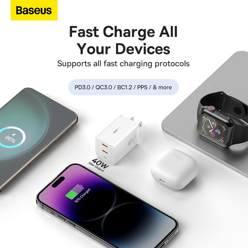 Tên Cốc Sạc Nhanh Nhỏ Gọn OS-Baseus GaN5 Pro Fast Charger C+C 40W US (Chân cắm dẹp US)