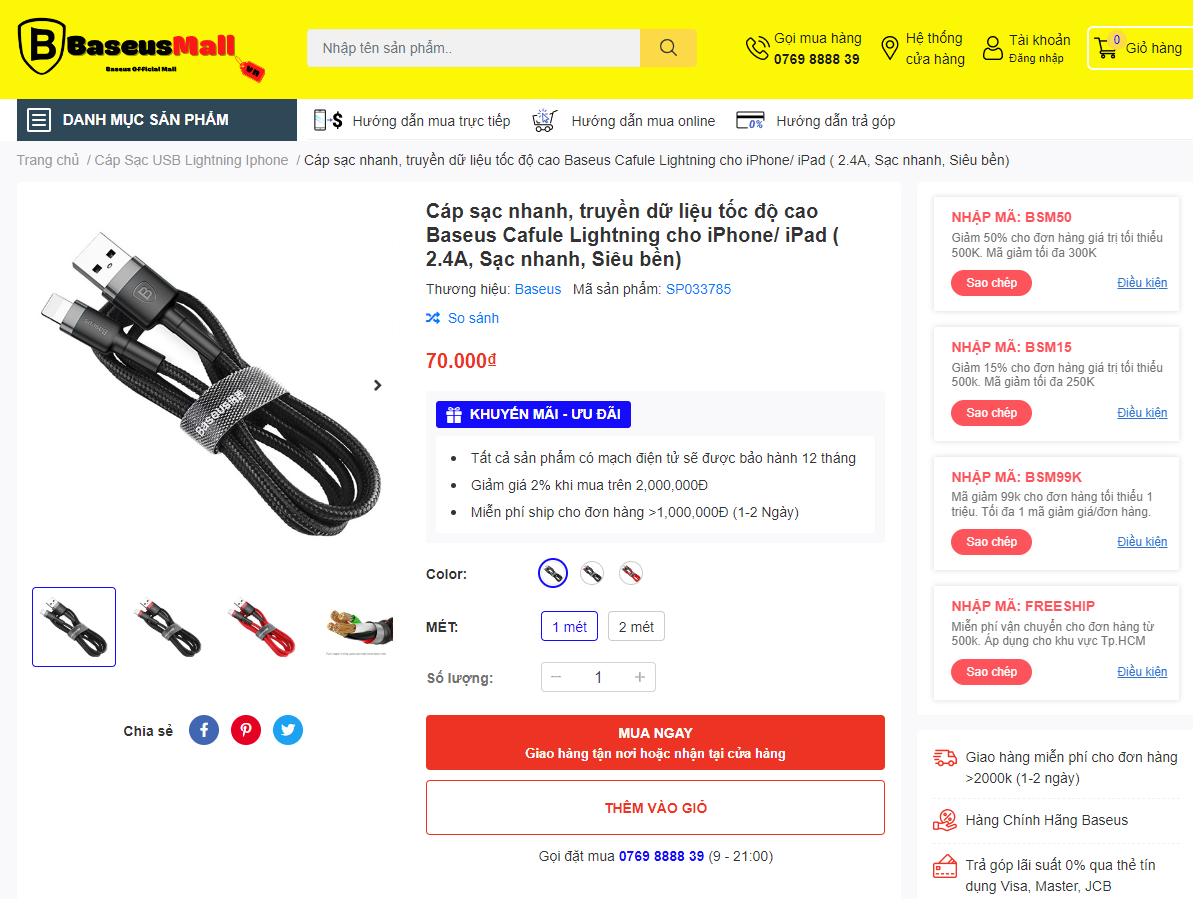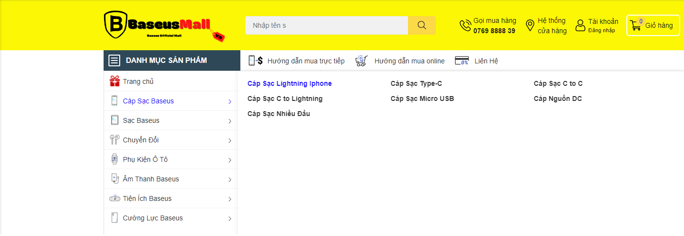 2. Tìm theo danh mục sản phẩm trên thanh menu (Cáp sạc , Phụ Kiện Oto , Tai Nghe,...)