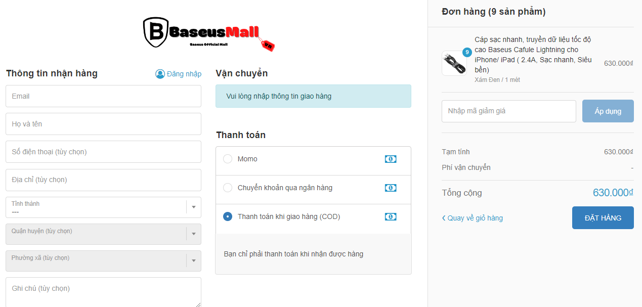 1. Thanh toán khi nhận hàng bằng tiền mặt (COD).