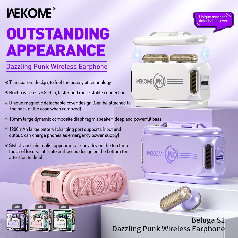 Tai Nghe Bluetooth Wekome Outstanding Appearance Beluga S1 Wireless Earphone là sự kết hợp giữa thiết kế nổi bật và chất âm xuất sắc, đem lại trải nghiệm nghe nhạc đẳng cấp cùng với phong cách độc đáo.