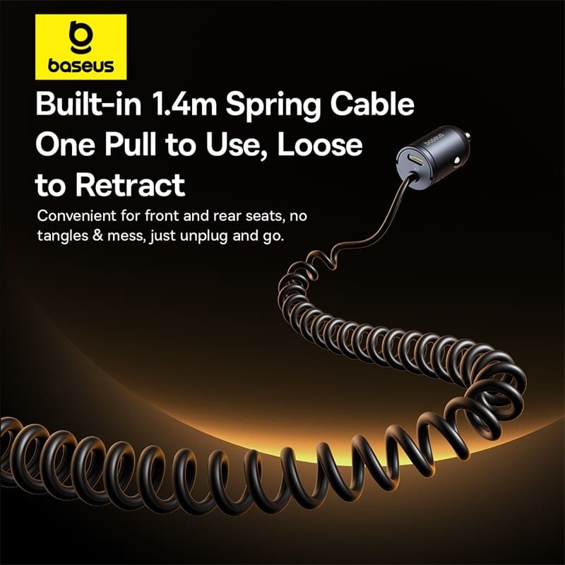 Tẩu Sạc Baseus 30W Kèm Cáp Lò Xo | Sạc 2 Thiết Bị, Có Tay Cầm Kéo Ra Tiện Lợi