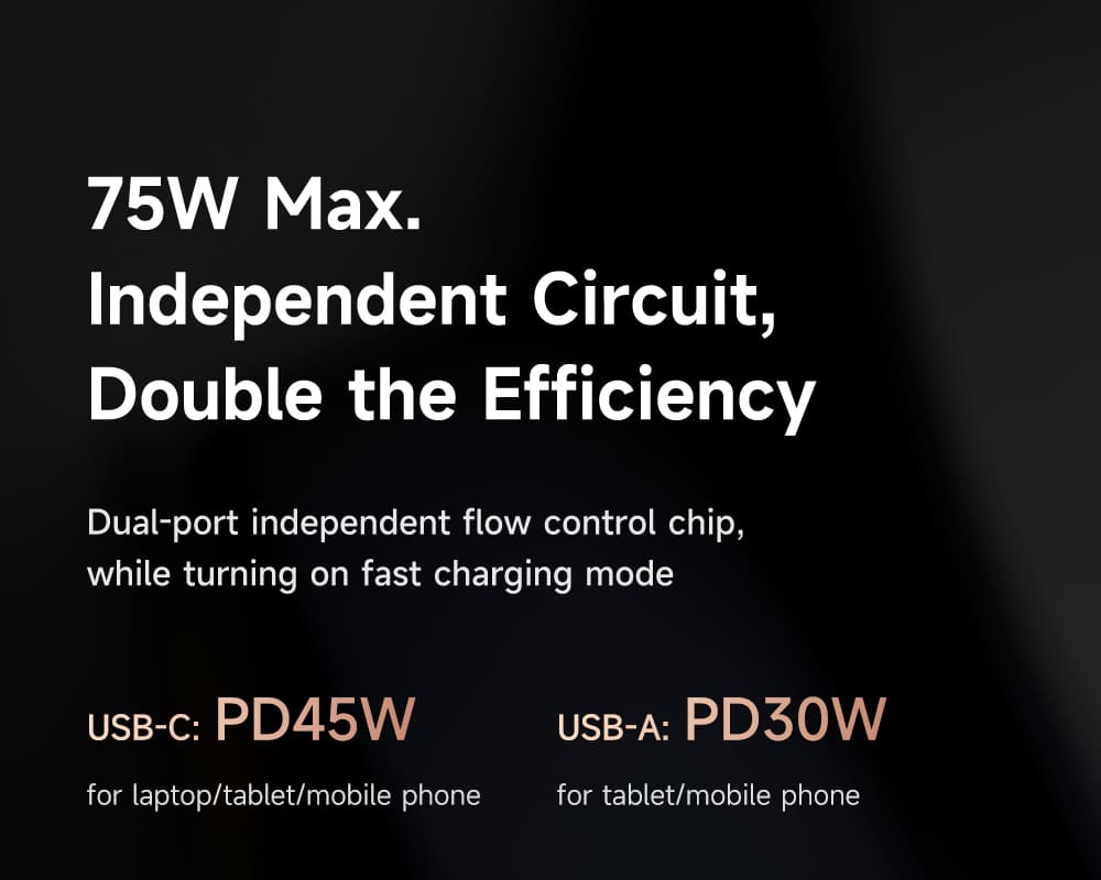 • SẠC SIÊU NHANH 2 CỔNG 75W: Sạc đồng thời 2 thiết bị (Type-C 45W + USB 30W) ở tốc độ cao nhất.